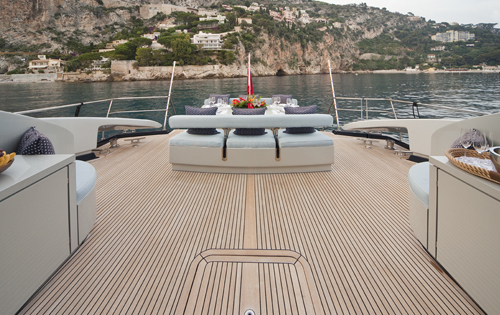M/Y IRINA offers guests plenty of external living areas; the aft deck is adjacent to the salon through large sliding glass doors and features an alfresco dining option with an optional retractable Bimini allowing the multi-use space to quickly be converted into a sunbather’s paradise.