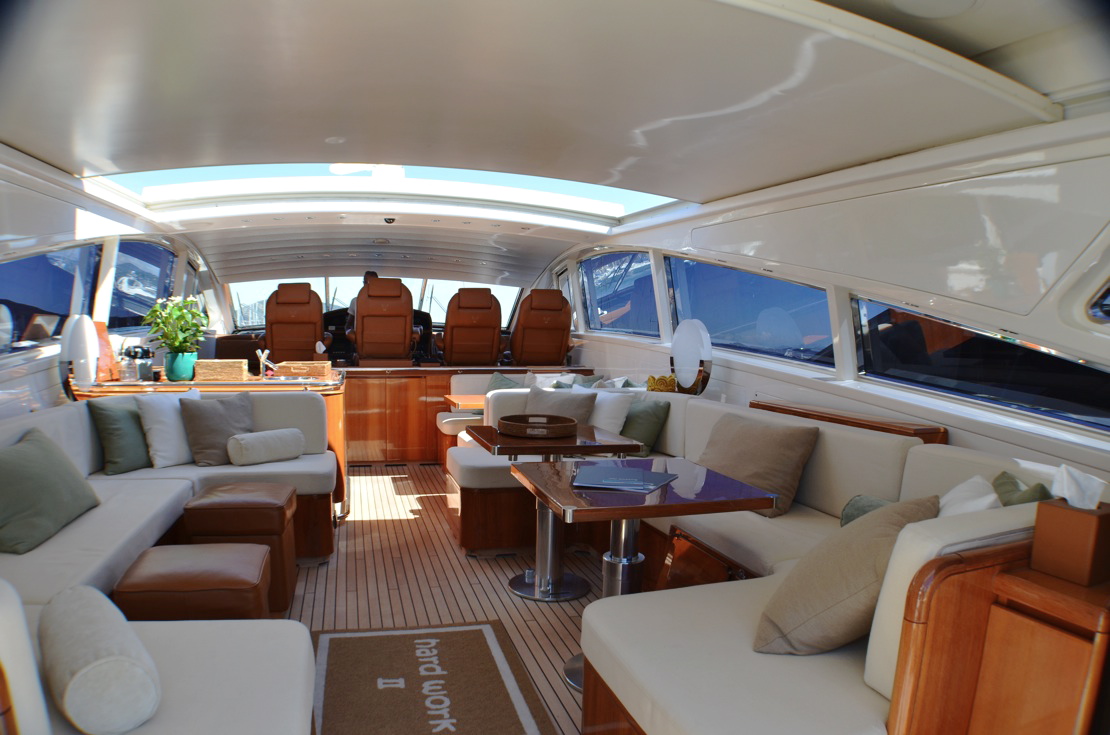 An indoor deck salon is located on the main deck. The creative design allows ultimate comfort with 2 large U shaped sofas on either side, adjustable height tables and a further smaller table with seating forward. A retractable roof is both unique and functional.