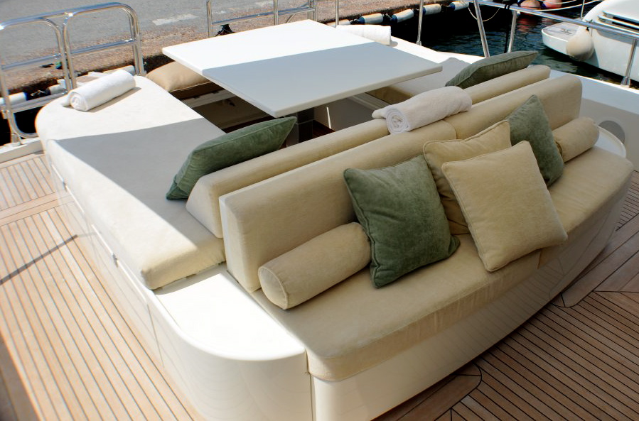 An indoor deck salon is located on the main deck. The creative design allows ultimate comfort with 2 large U shaped sofas on either side, adjustable height tables and a further smaller table with seating forward. A retractable roof is both unique and functional.