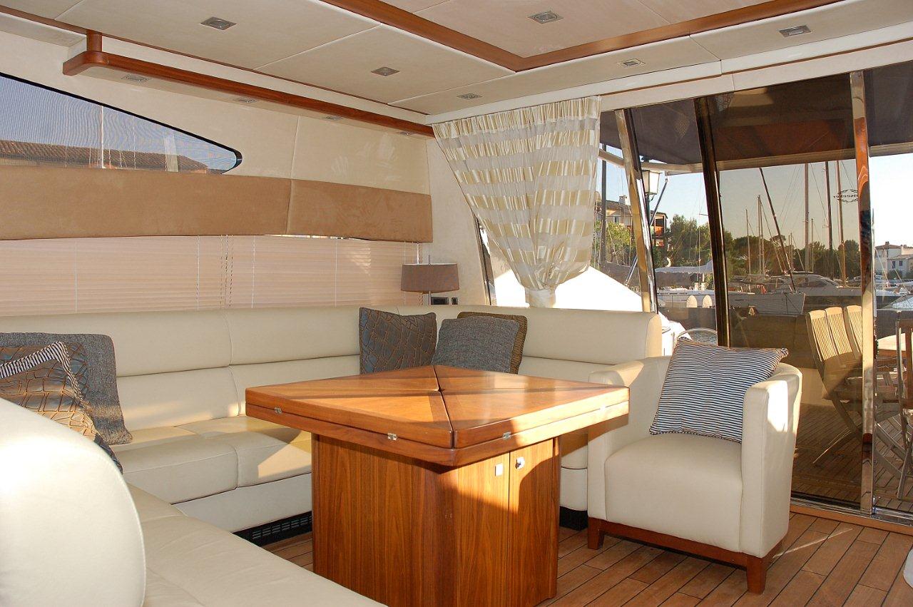 Full sliding glass doors lead from the aft deck into the salon featuring a U shaped sofa with adjustable table, forward and down is a smaller dining table with a full beam VIP cabin further forward, aft a full beam master cabin with double bed, vanity and love seat plus a twin cabin complete the accommodation.