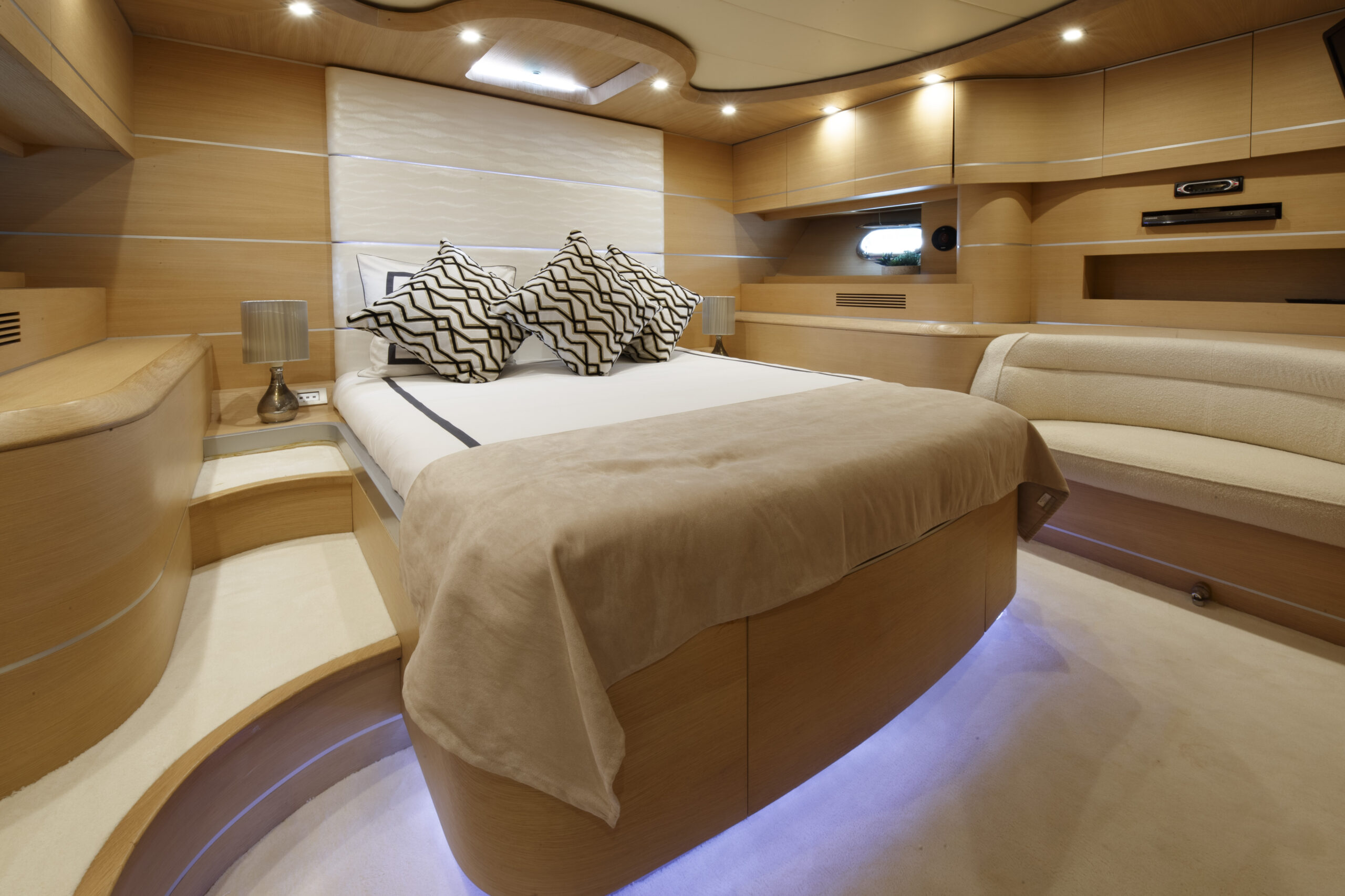 The KOKAB motor yacht can accommodate 6 charter guests in 3 well-appointed en-suite cabins. The master stateroom is full beam of the yacht forward, with a center lined queen size bed. A guest double is aft on the starboard side and a further guest cabins offers 2 single side by side beds, plus a Pullman berth.