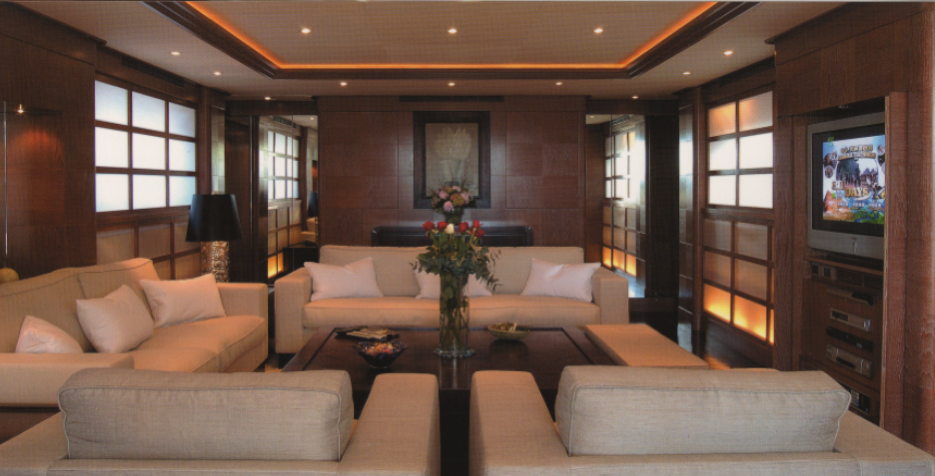 The salon is generous and boasts a large suite of 2 relaxing sofas, 2 occasional chairs and a large coffee table, ideal for socializing. A full entertainment center is available on the starboard side. Further forward and separated by bulkhead panel, is the formal dining area, offering a full beam layout and dining for all 8 guests.