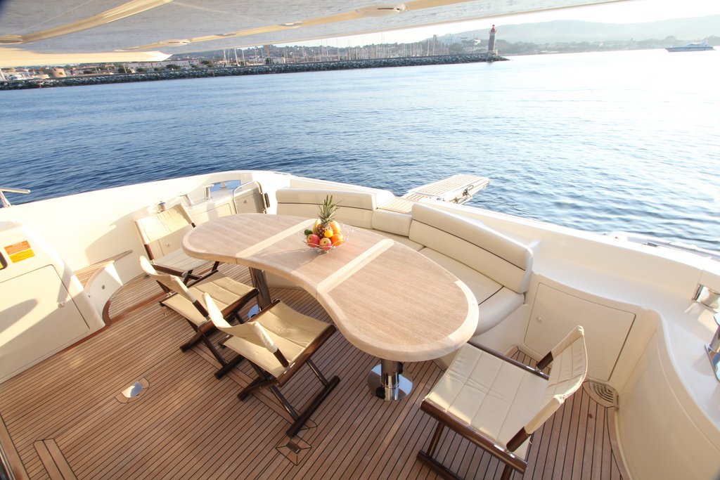 Apart from the large flying bridge above that offers ample sunbathing, a dining table, an electric barbecue and great views, the Azimut 62 Evolution yacht WilJim also has a spacious aft deck with an al fresco dining table, perfect for breakfast lunch or dinner while at anchor.