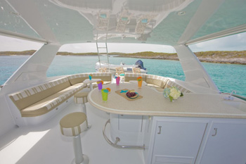 Exterior living aboard the yacht TEMPTATION is generous and laid out on 2 decks. The aft deck offers shade, an alfresco dining option and drink service area.