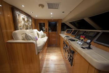 Further forward, a marble topped breakfast bar separates the galley on port. Starboard of the galley is a comfortable built in dinette, ideal for less formal meals.