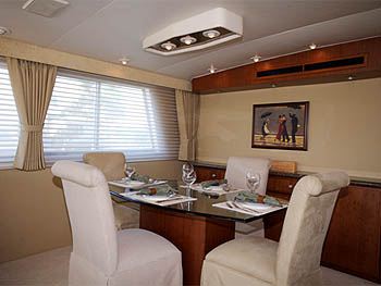 Luxury yacht BELLA SOPHIA has a comfortable main salon with cream carpets and sofa seating, with a dining area forward.