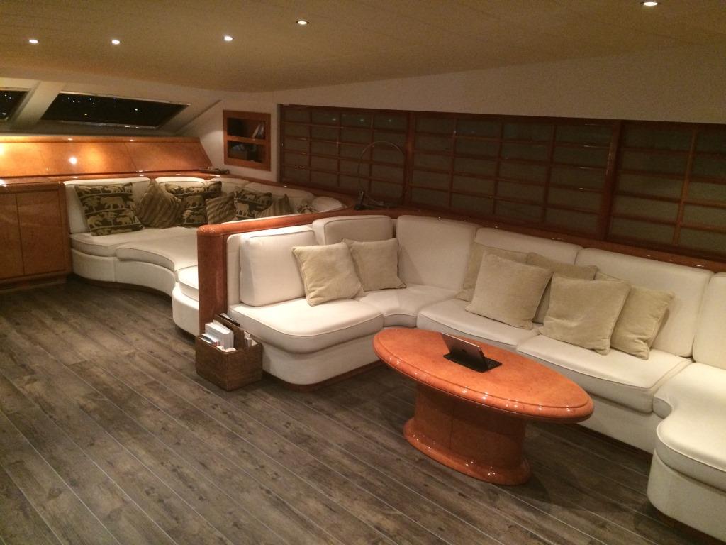 Her main salon features ample seating and wrap around windows for optimum natural light. Below decks are 4 guest cabins, including a full beam master stateroom, full beam VIP cabin, a double cabin and one twin cabin.