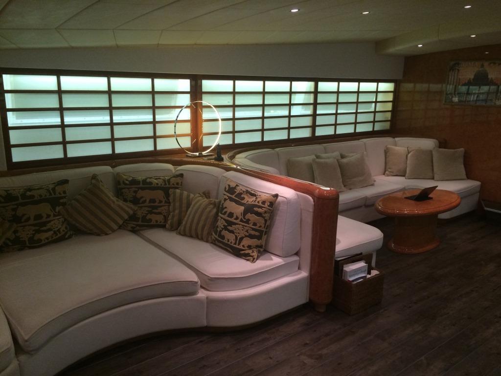 Her main salon features ample seating and wrap around windows for optimum natural light. Below decks are 4 guest cabins, including a full beam master stateroom, full beam VIP cabin, a double cabin and one twin cabin.