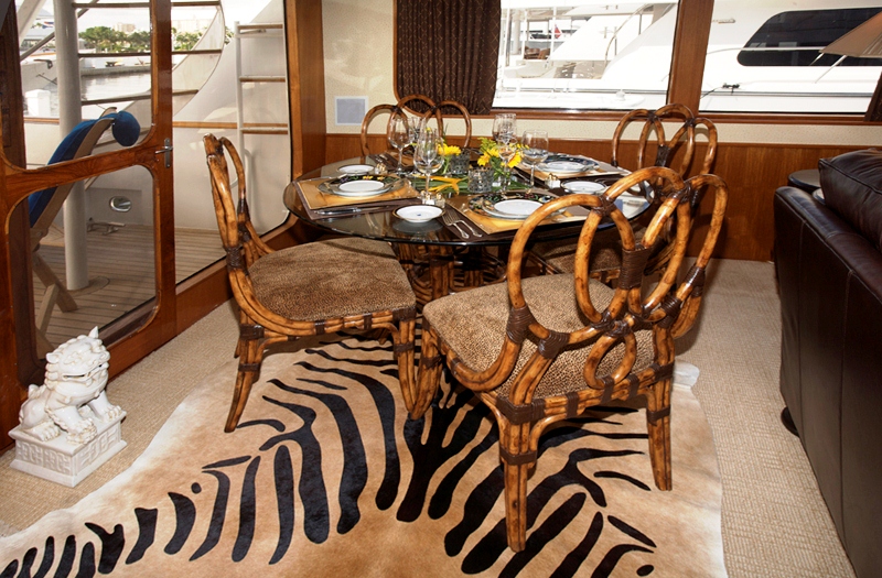 The main salon boasts a gentlemanly tone, with rich drown plush leather sofas, a large dark wooden coffee table, beverage fridge and full entertainment systems with SAT TV. A games or snack table sits to one side, unique rugs add a distinctive classy feel, worldly ornaments and art create a sophisticated atmosphere.