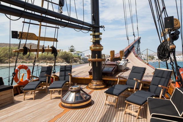 The large open-air deck, made of the highest quality teak wood, is ideal for relaxing in one of the sunbeds and preparing the body & soul for a dip in the turquoise waters of the Aegean Sea.