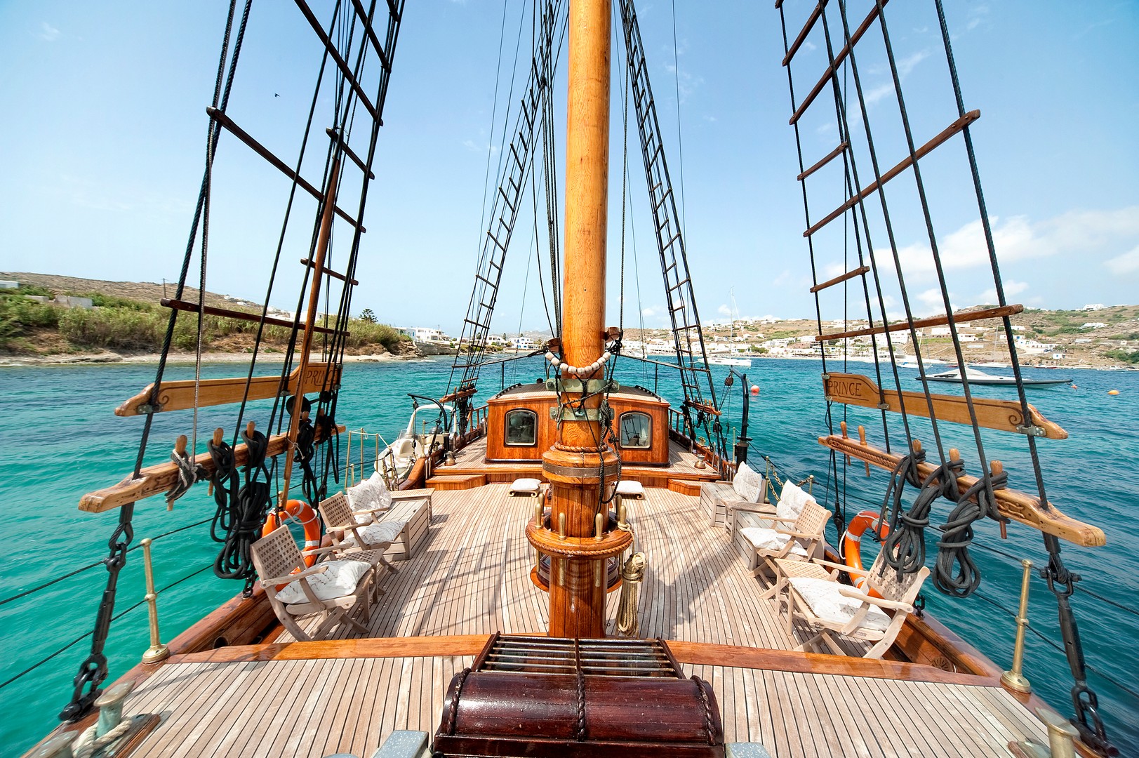 The large open-air deck, made of the highest quality teak wood, is ideal for relaxing in one of the sunbeds and preparing the body & soul for a dip in the turquoise waters of the Aegean Sea.