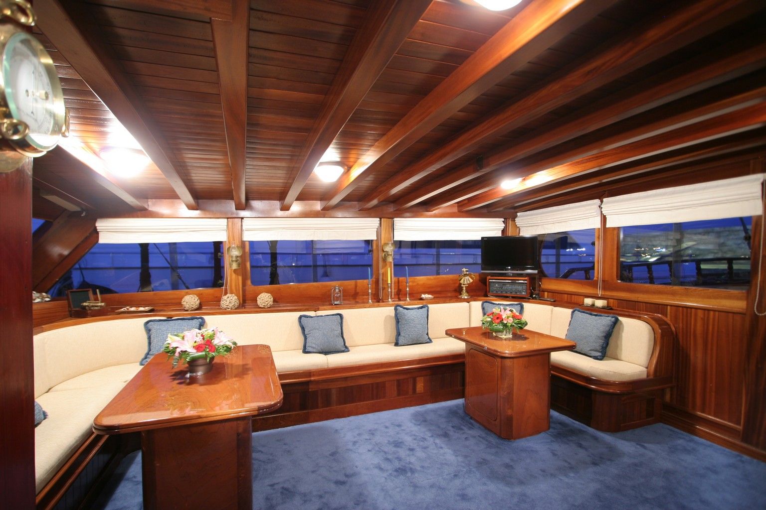Her main saloon adjacent to the galley area is of traditional design with rich mahogany panelling, where charter guests can dine in style around a teak dining table. The main saloon leads onto the spacious aft deck with al fresco dining facilities around a teak table.