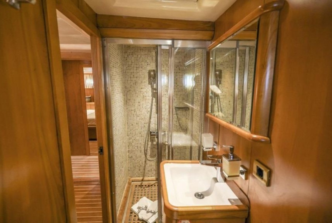 Charter yacht AEGEAN SCHATZ offers deluxe interiors featuring fine mahogany with inlay floors, hand polished cherry wood panels and fine soft furnishings, the décor is warm and welcoming, yet minimalistic.