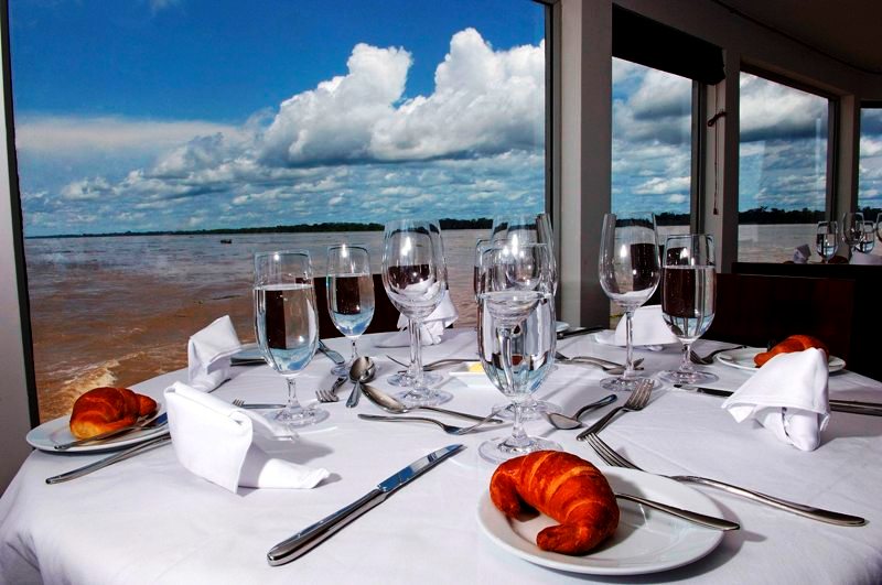 Aqua’s Dining room has panoramic views into the great wilderness. Fine china and crystal and superb service are part of the experience, similar to what you would expect from a fine dining restaurant in Lima.