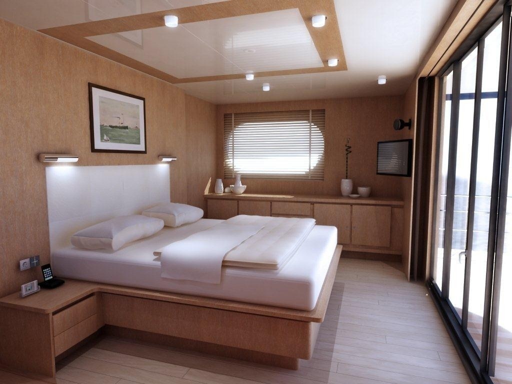 A crisp white leather suite in the lounge is invitingly comfortable on the starboard side, while in an open plan, the formal dining area forward boasts a crystal clear glass table, flanked by quality high back black leather chairs. A full state of the art entertainment system and flat screen TV is on the port side of the salon.