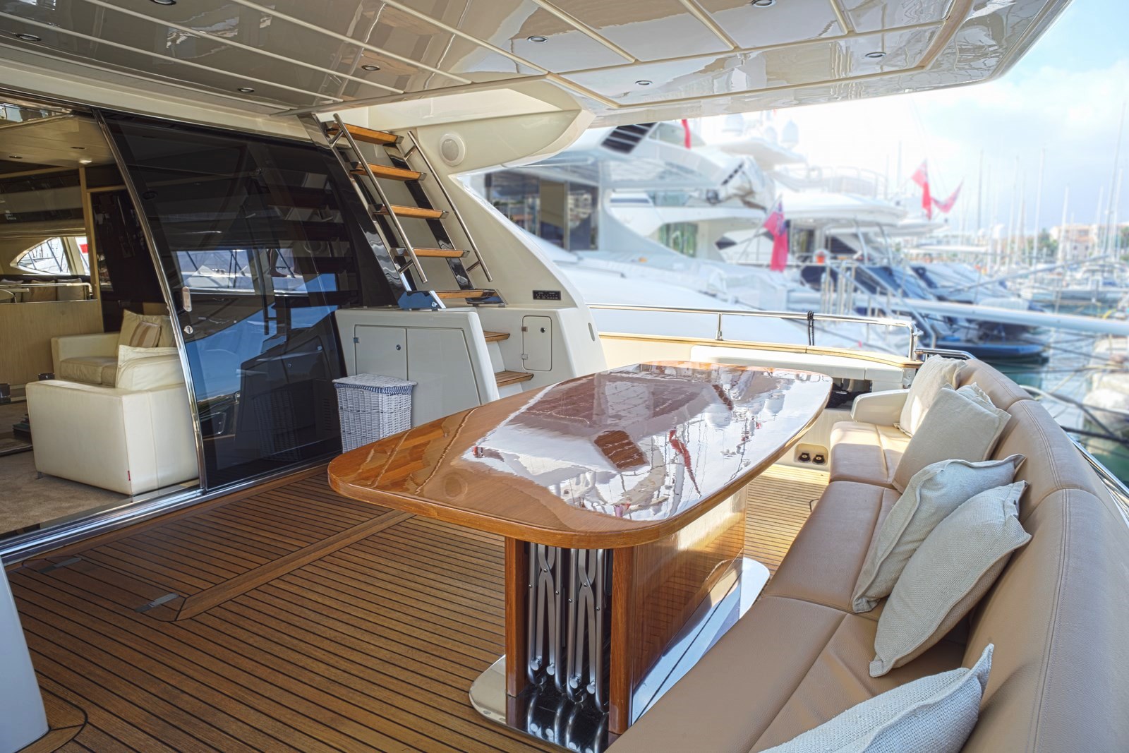 The aft deck is shaded and offers an alfresco dining option and seating, further aft off the transom, is an extended swim platform. Sun lovers or romantic couples will enjoy the double sunpad on the foredeck, complete with fold-away Bimini cover, ideal for shade or privacy.