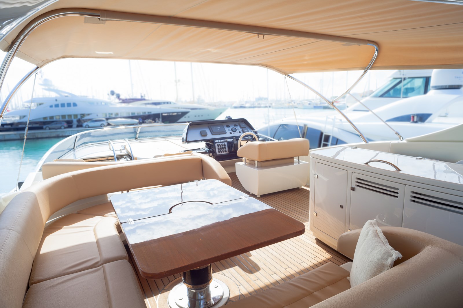 Above the main deck, the flybridge offers a further alfresco dining option perfect for a romantic candlelit dinner, additional seating and collapsible Bimini cover.