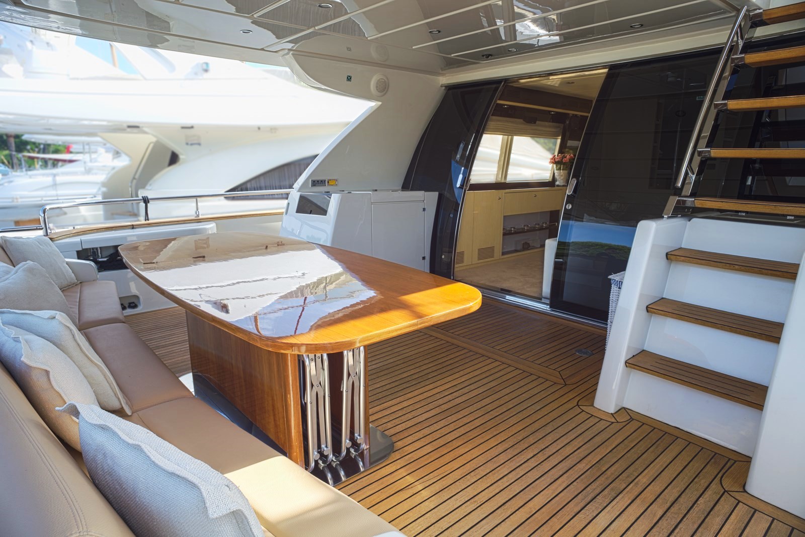 The aft deck is shaded and offers an alfresco dining option and seating, further aft off the transom, is an extended swim platform. Sun lovers or romantic couples will enjoy the double sunpad on the foredeck, complete with fold-away Bimini cover, ideal for shade or privacy.