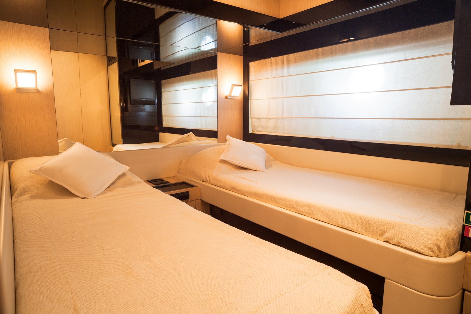Charter yacht DOLCE MIA features 4 spacious cabins for up to 8 guests charter guests, each cabin offers en-suite facilities and TV entertainment. The master suite is amidships and full beam of the yacht with a queen-size bed, a VIP cabin is forward and full beam of the yacht. A further two twin guest cabins have 2 side by side single beds.