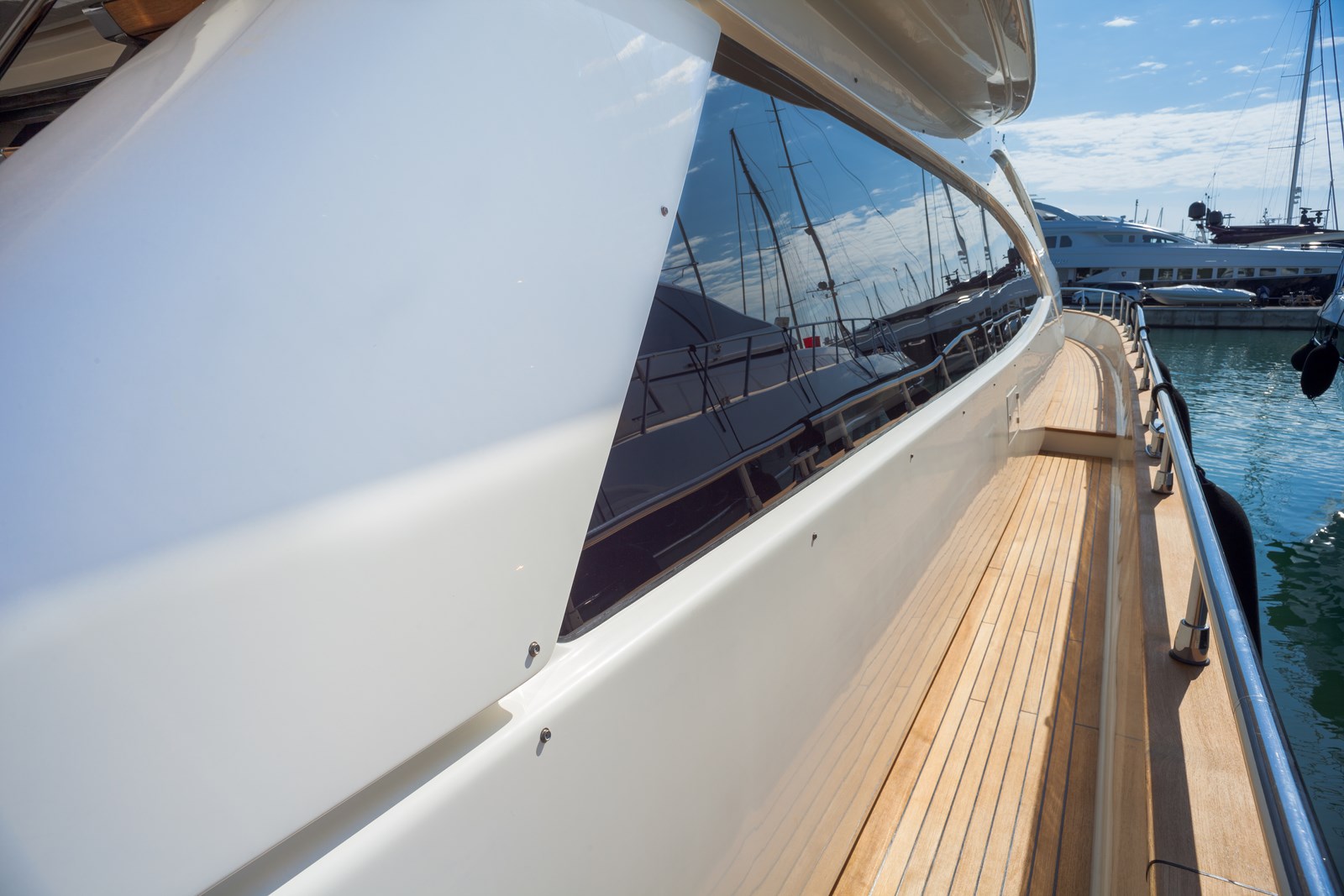 The aft deck is shaded and offers an alfresco dining option and seating, further aft off the transom, is an extended swim platform. Sun lovers or romantic couples will enjoy the double sunpad on the foredeck, complete with fold-away Bimini cover, ideal for shade or privacy.