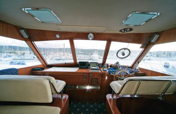 The salon has contemporary feel, featuring rich wood panels, cream leather soft furnishings and fine blue carpeting. A cleverly built table rises to become a formal dining area, thus not using precious salon space. Panoramic windows and overhead hatches provide ample natural light.