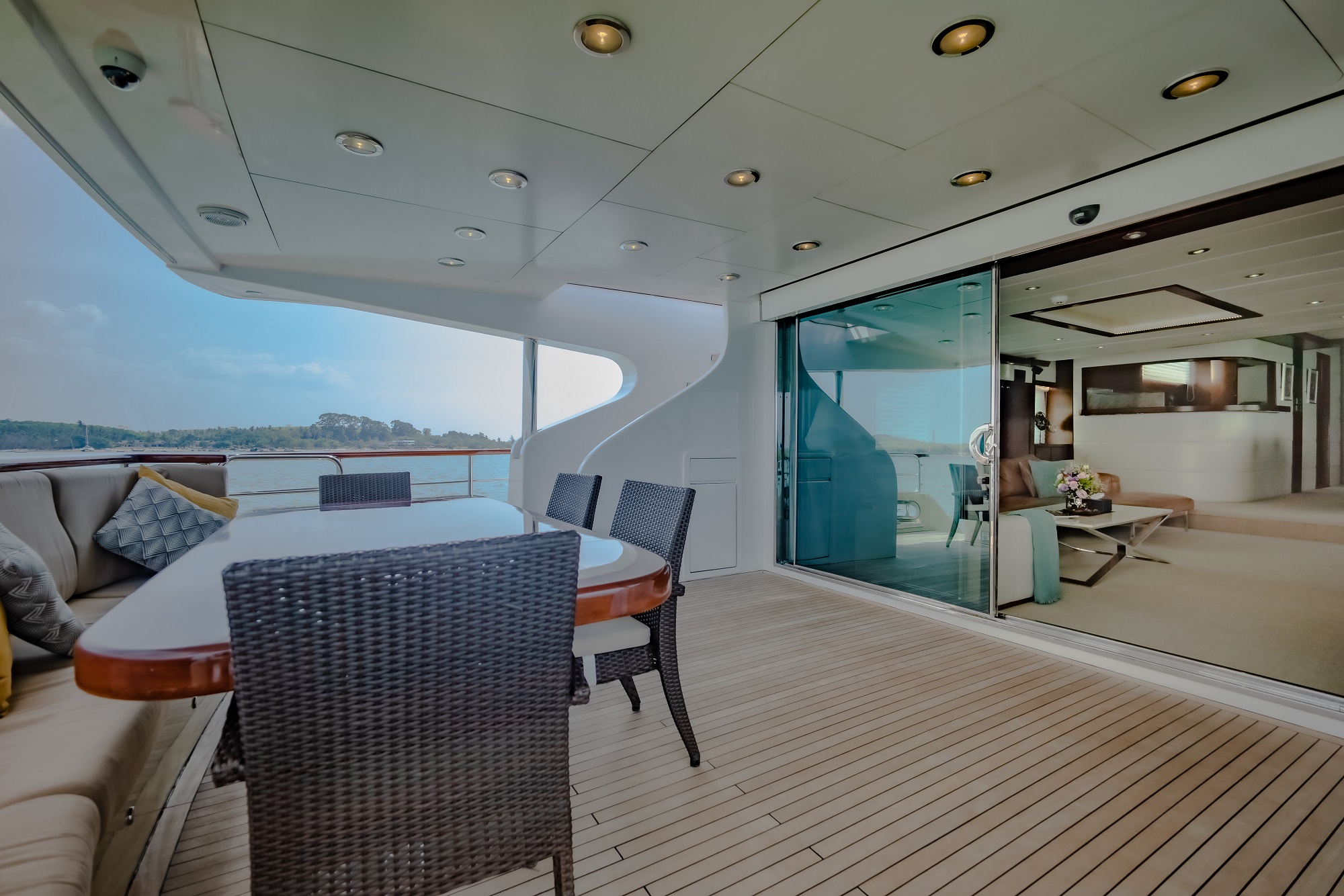 Luxury yacht LOW BLOW has a good sized aft deck with sun beds and a sofa, leading to ...