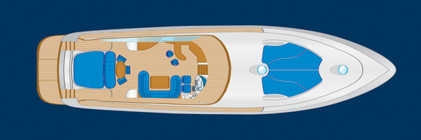 Luxury yacht LOW BLOW has a good sized aft deck with sun beds and a sofa, leading to ...