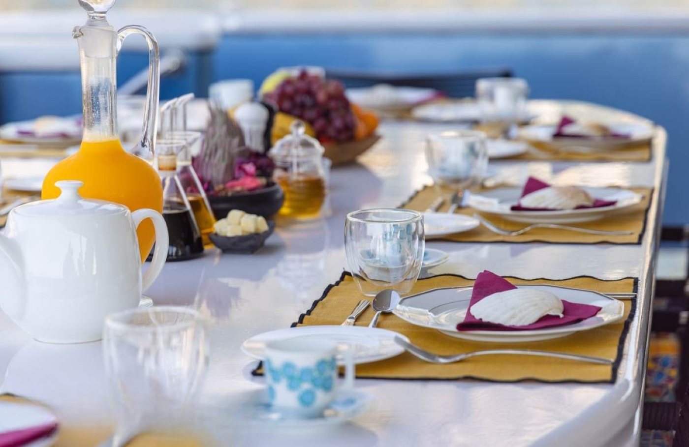 The salon and dining are an open plan with the dining located forward, a large custom etched mirror reflects more space and light from the ample windows surrounding. The salon offers a large L shaped sofa with clear glass coffee table and swiveling flat screen TV.