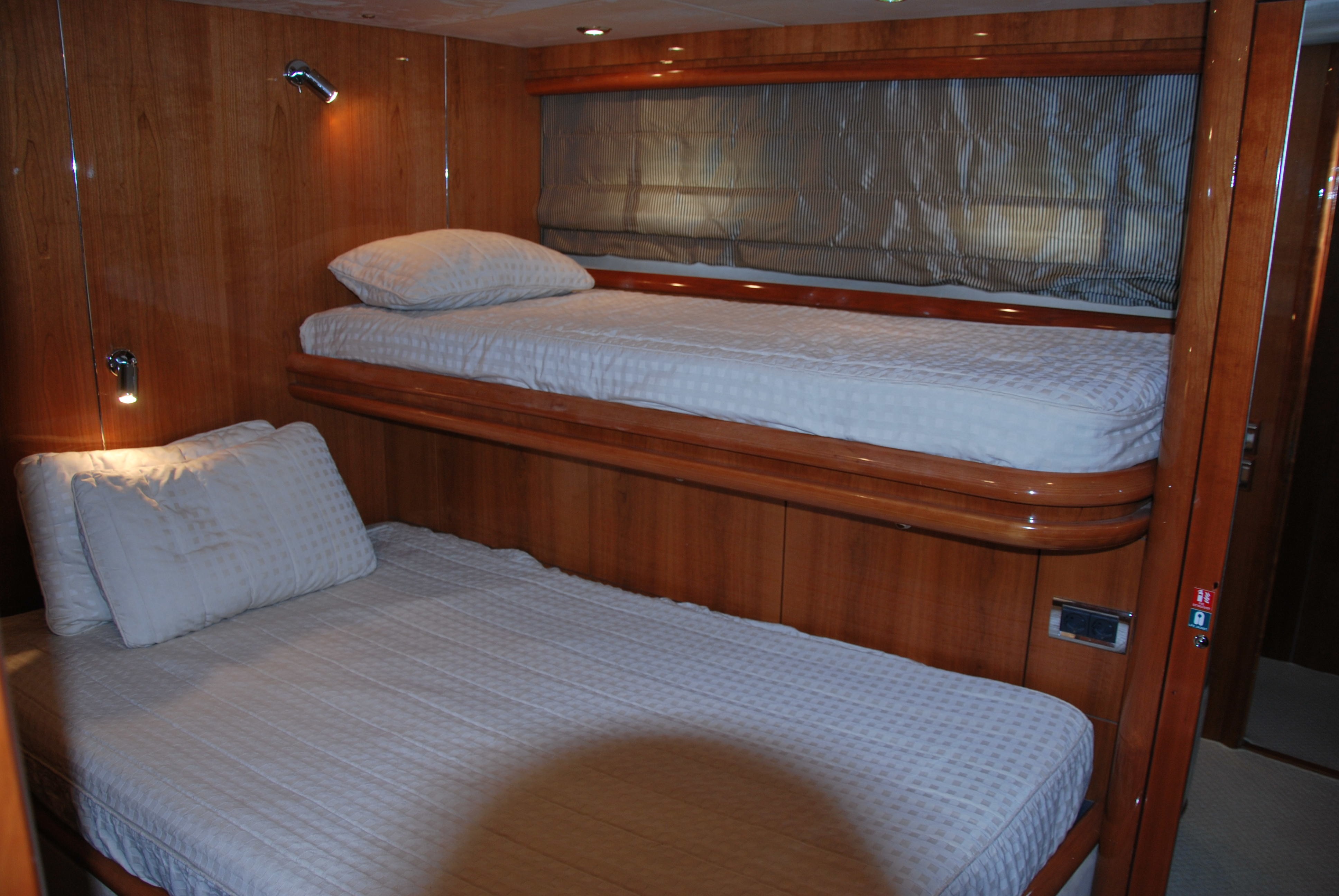 The master stateroom is amidships with a queen size bed and marble en-suite facilities with bath and his and hers sinks. A VIP cabin is forward with a double bed and en-suite facilities. A further 2 cabins offer single beds, one with bunk bed style the other side by side twins, both cabins have en-suite facilities.