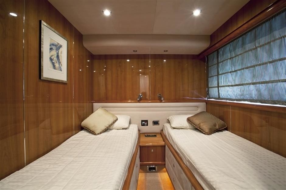 The lounge is aft with 2 large sofas, a coffee table and large flat screen TV, wide glass doors open out onto the shaded aft deck where guests can dine alfresco. Forward of the salon amidships, a formal dining table is adjacent to the wet bar.