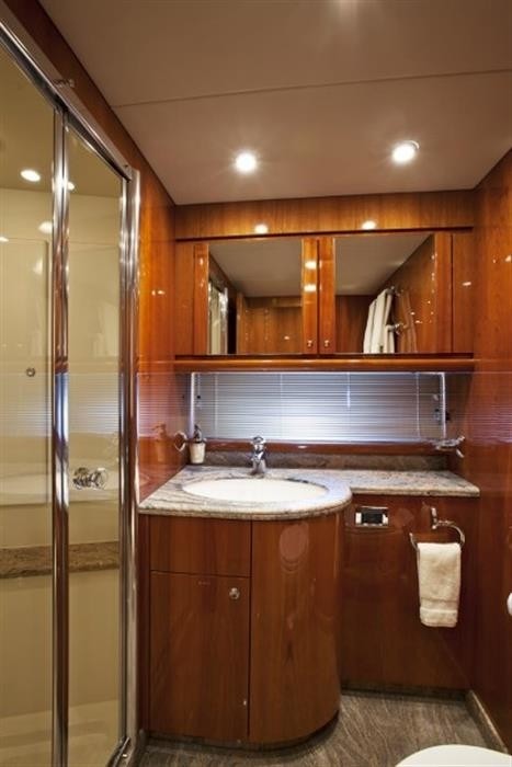 The lounge is aft with 2 large sofas, a coffee table and large flat screen TV, wide glass doors open out onto the shaded aft deck where guests can dine alfresco. Forward of the salon amidships, a formal dining table is adjacent to the wet bar.