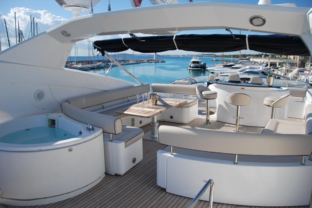 A massive flybridge is perfect for entertaining, accessed from the aft deck, it offers 3 helm seats forward, sun pads, a wet bar with seating, an alfresco dining option, lounge space, Spa Pool tub, chaise lounges and ample open deck areas, complete with a removable Bimini cover.