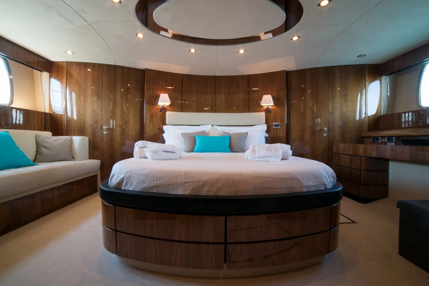 Forward the formal dining table is in a raised position and seats all 8 guests with ease. The well-appointed galley is opposing the formal dining area and has a sliding door to enclose completely. Thanks to elongated side windows in the salon, it receives an abundance of natural light.