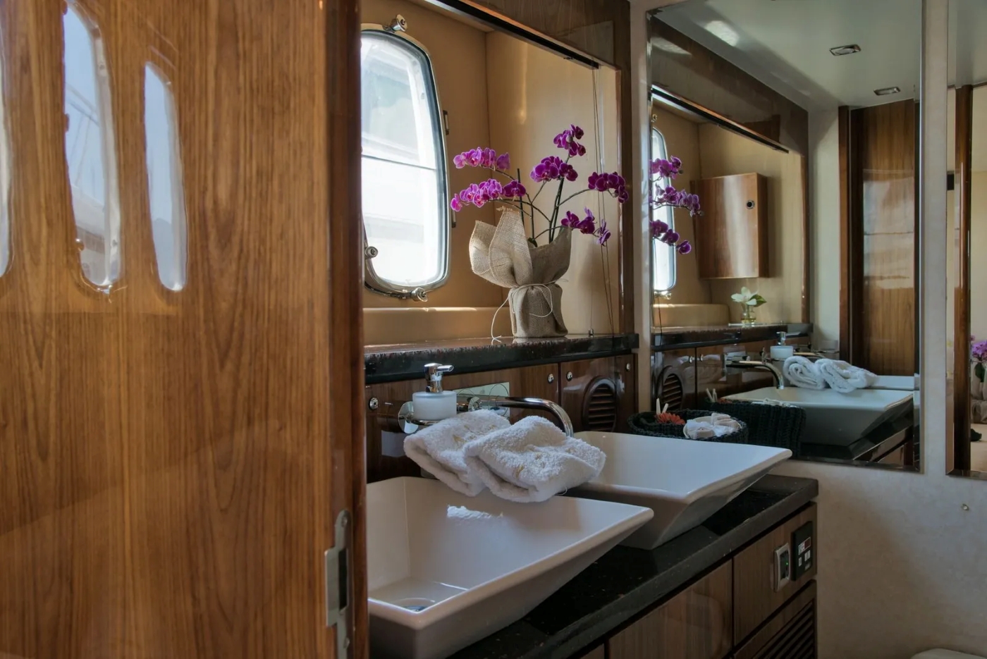 The interiors are elegant and refined, featuring high gloss rich wood panels, supple cream leather furnishings and ample natural light throughout. The salon offers a generous 3 piece leather suite, coffee table and full entertainment systems. Forward the formal dining table is in a raised position and seats all 8 guests with ease.