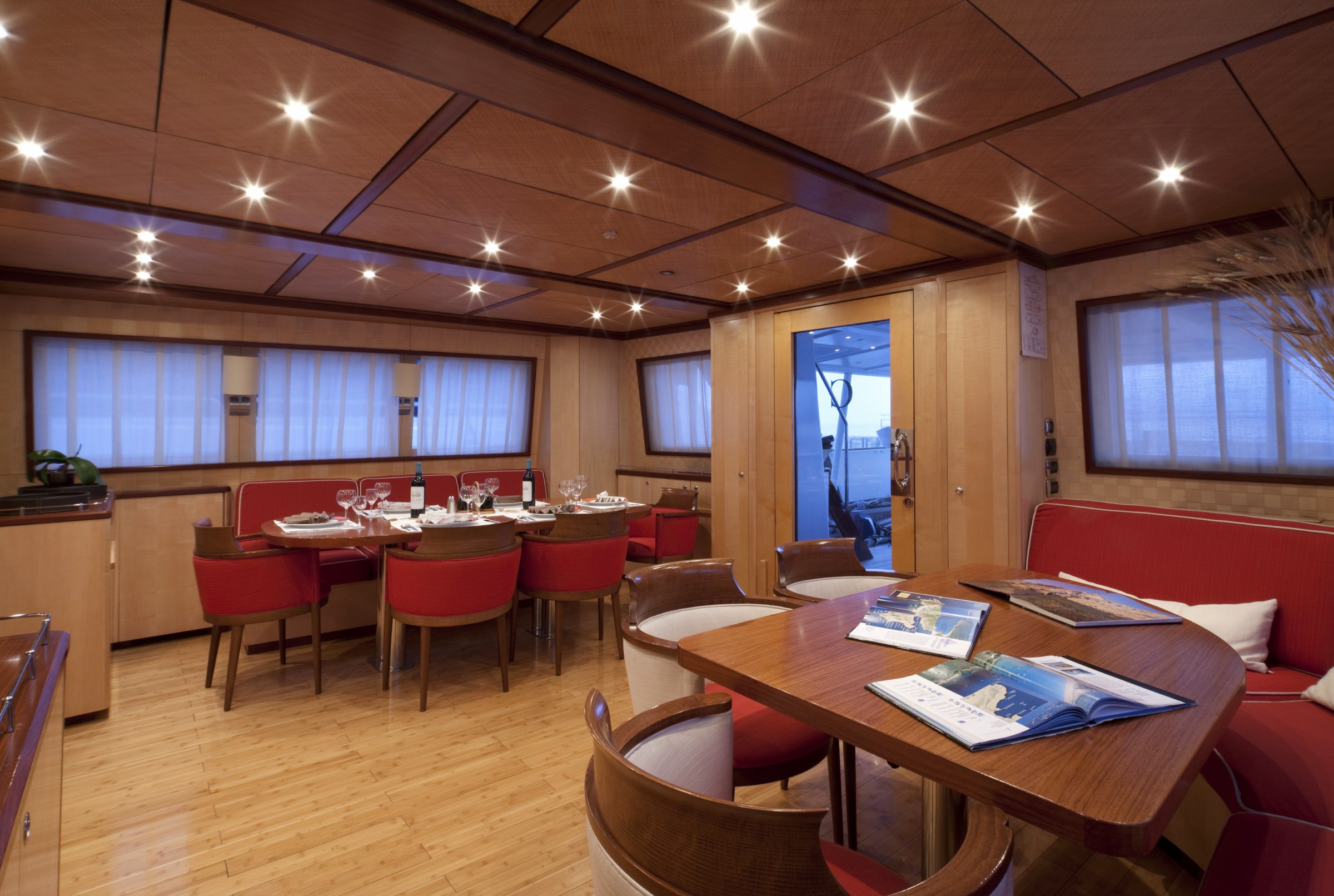 Aft and separate of the salon is the formal dining area, complete with two elegant dining tables. On the upper deck is the dull beam master cabin, while on the lower deck is the full beam VIP cabin, 1 double and 3 twin cabins. Charter yacht CLARA ONE is fully air conditioned throughout.