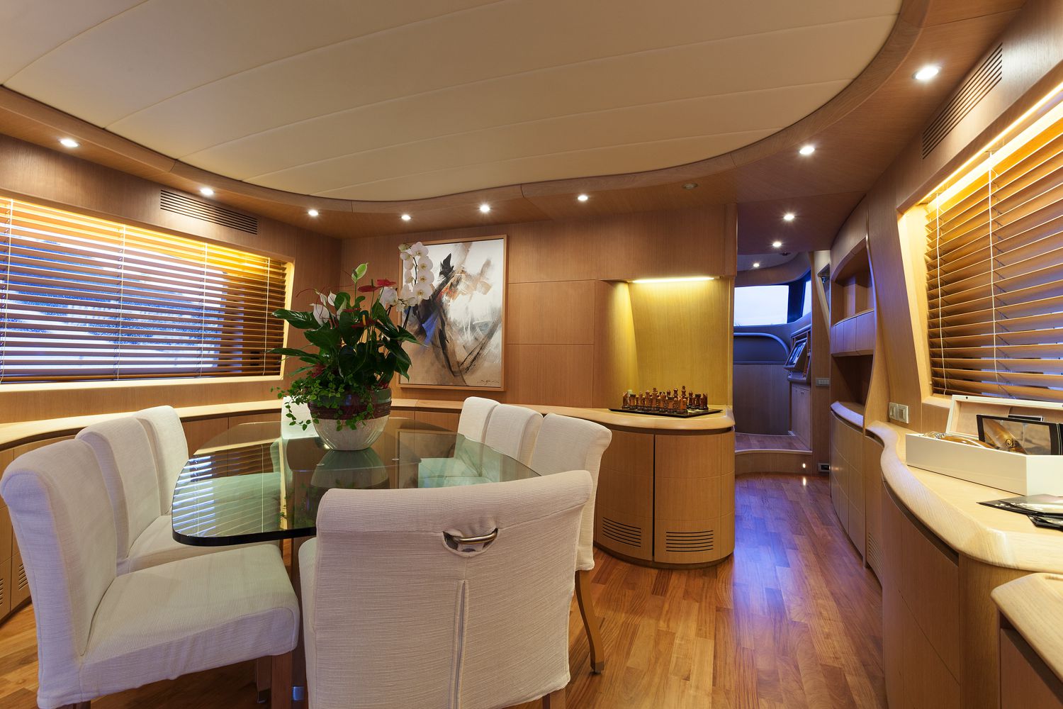 Forward of the salon, in an open plan, is the stylish clear glass formal dining table. Large panoramic windows supply ample natural light, while Venetian blinds offer optimum privacy.