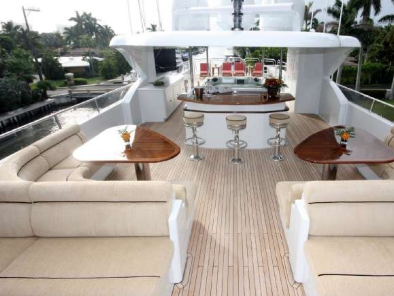 The main aft deck offers ample seating and convertible cocktail to the alfresco dining table, perfect for any occasion. Included on the aft deck is a custom teak and granite topped full-service wet bar and flip-down 50" LCD TV. The aft deck gives way to the full beam extended swim platform and inviting teak beach.