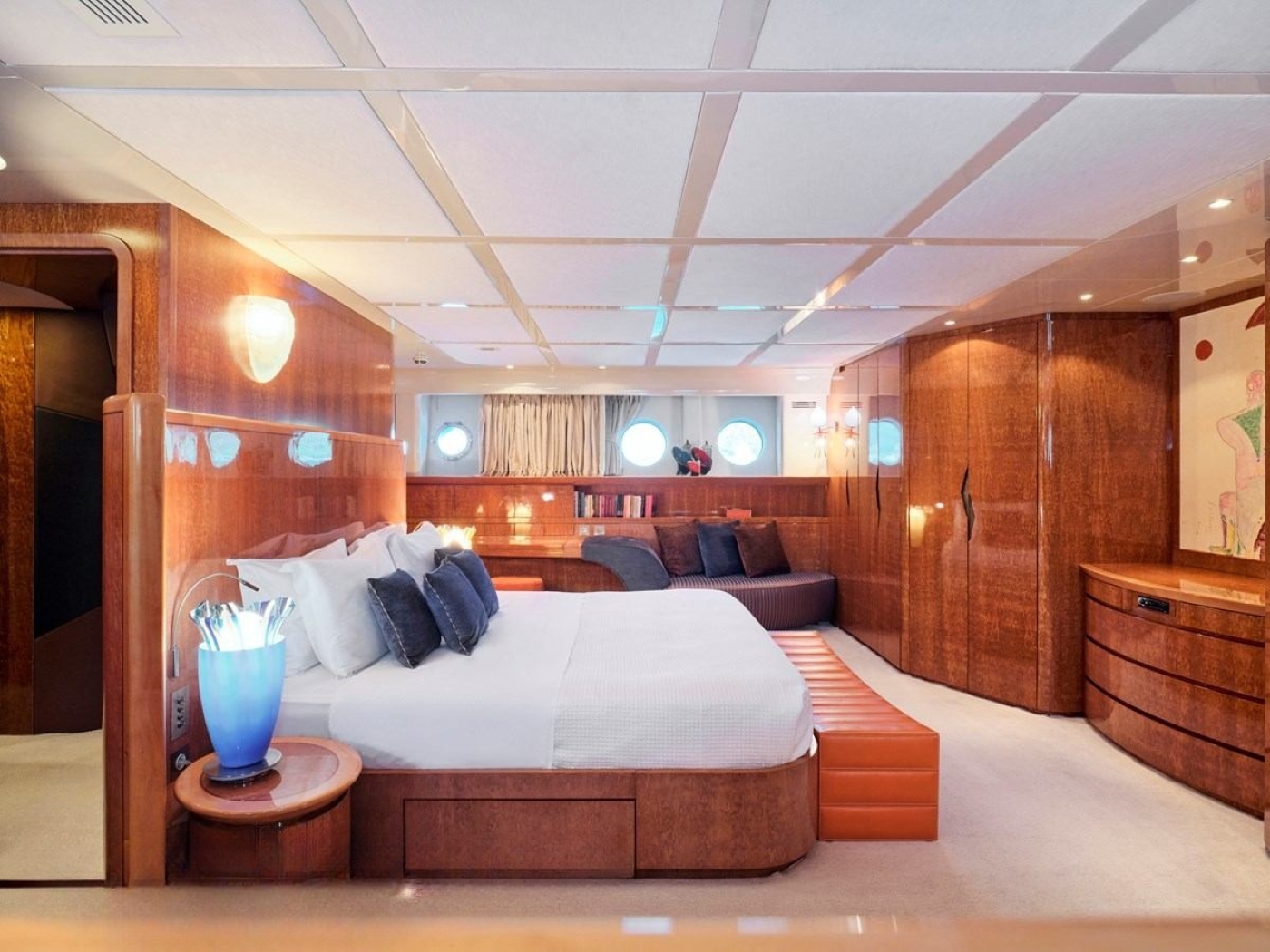 Winding stairs lead from the main salon up to the sky lounge foyer with access to another day head, pilothouse, and VIP stateroom. The sky lounge is capacious and has two large leather sofas, occasional leather chairs, an impressive granite wet bar with stool seating.