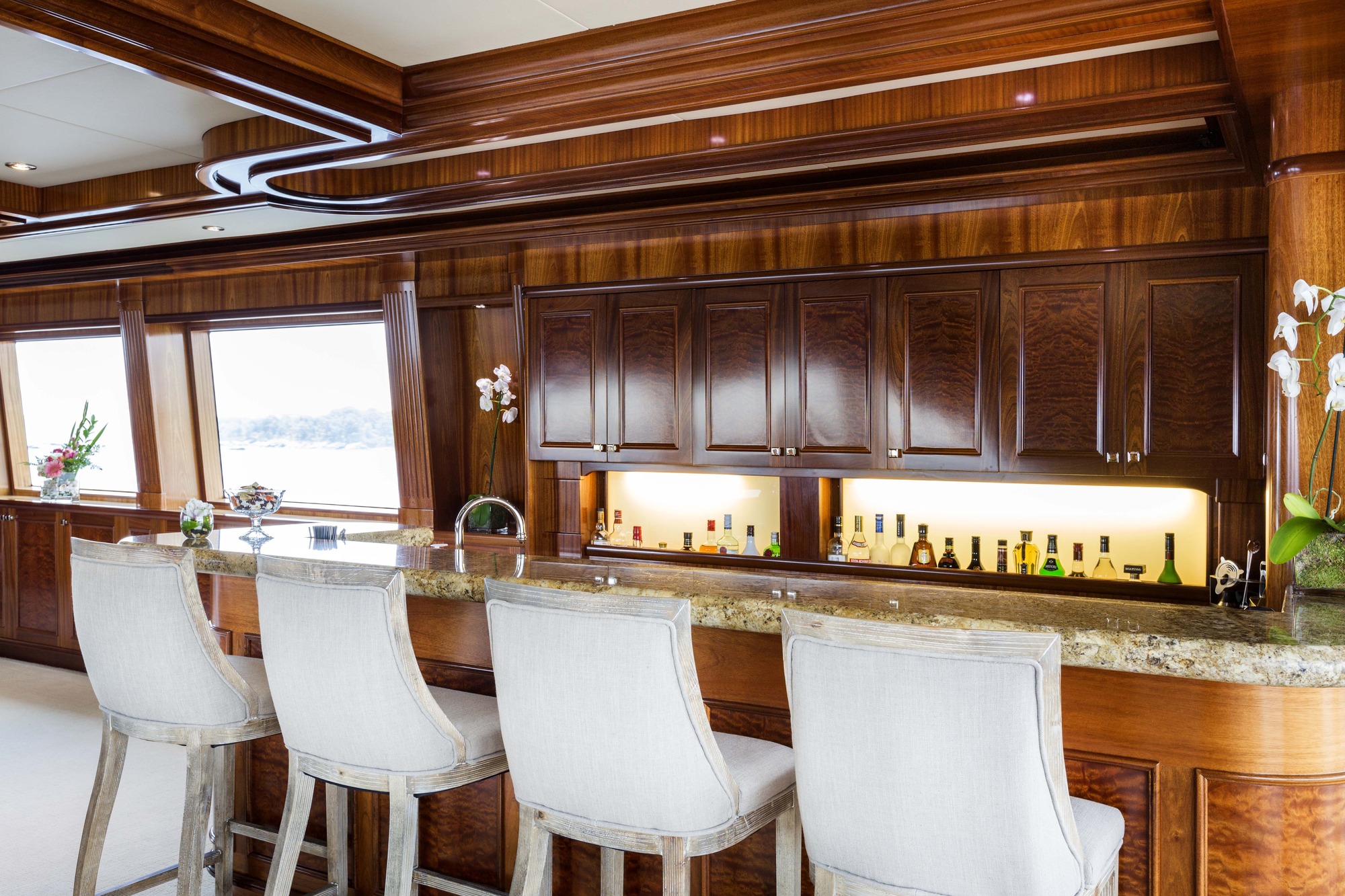 The sky lounge is capacious and has two large leather sofas, occasional leather chairs, an impressive granite wet bar with stool seating. The entertainment center includes 52" LCD TV, Denon receiver-amplifier, DVD, CD, media computer center and Karaoke.