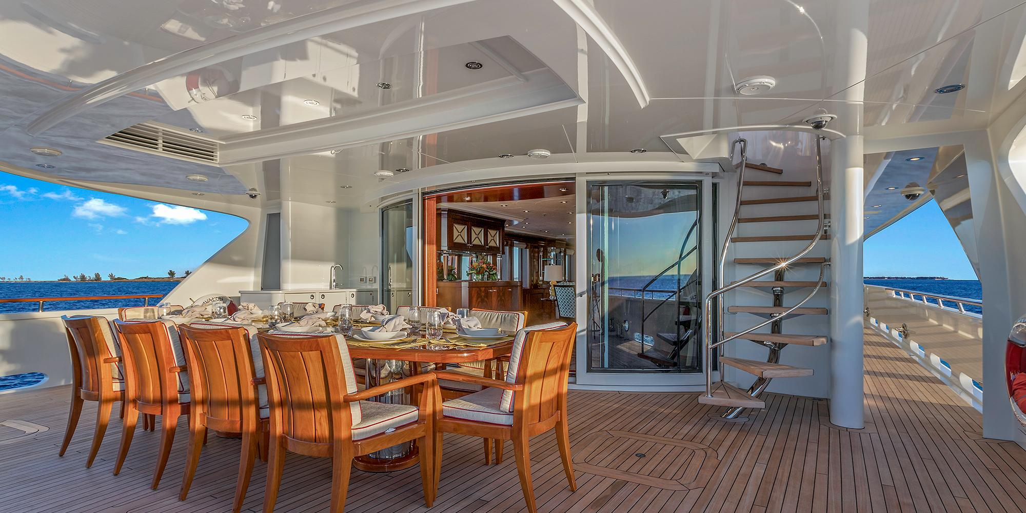 Further forward is the formal dining area with a custom mahogany dining table, and matching buffets port and starboard with inlays of Breccia Vendome stone. On the upper deck, so cosy there is a cosy sky lounge with large comfortable sofas, a games table, a bar area and a Flatscreen TV.