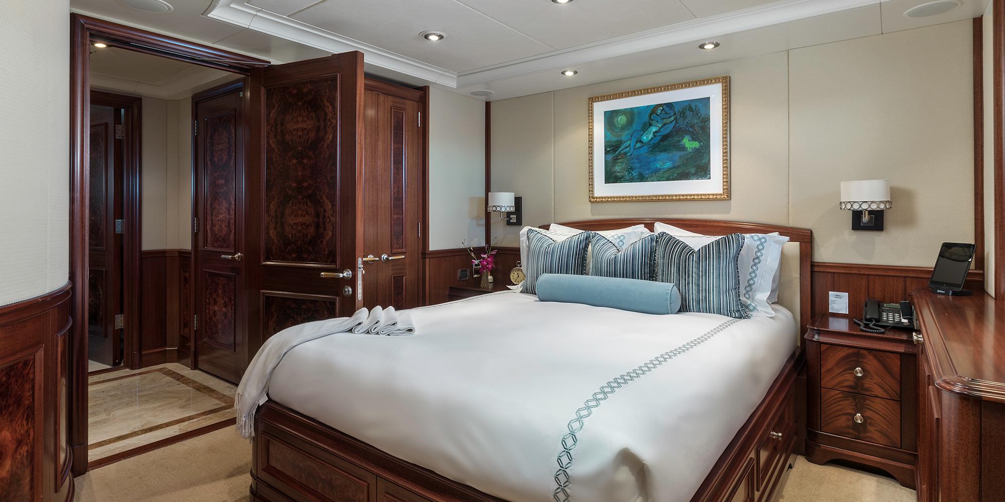 The main salon offers panoramic views through large windows, and curved glass entry doors flanked with a mirrored set of handsome bar cabinets. Further forward is the formal dining area with a custom mahogany dining table, and matching buffets port and starboard with inlays of Breccia Vendome stone.
