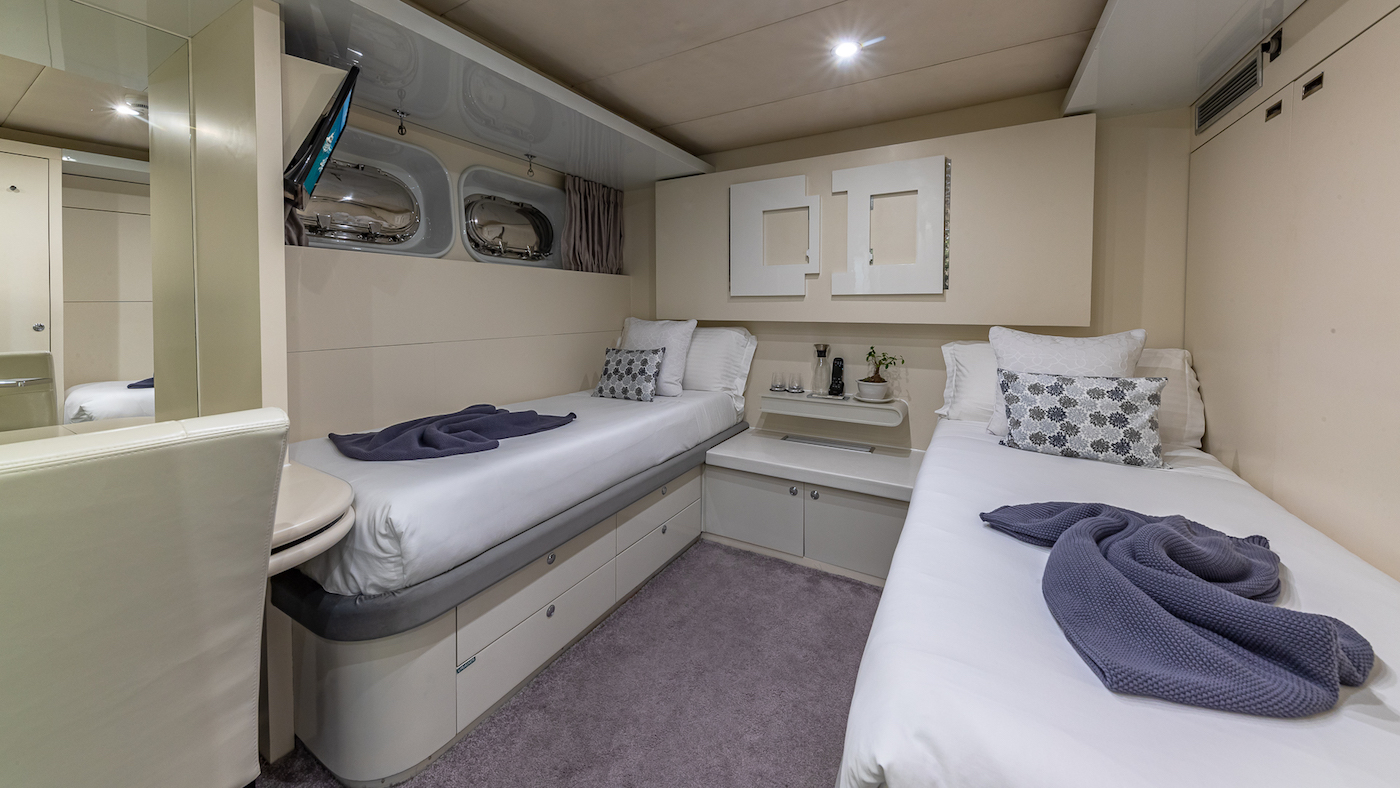 Luxury motor yacht charter boat 'Lionshare' accommodates up to 10 charter guests in 5 cabins and also offers possibility of extra berths for 2 small children.
