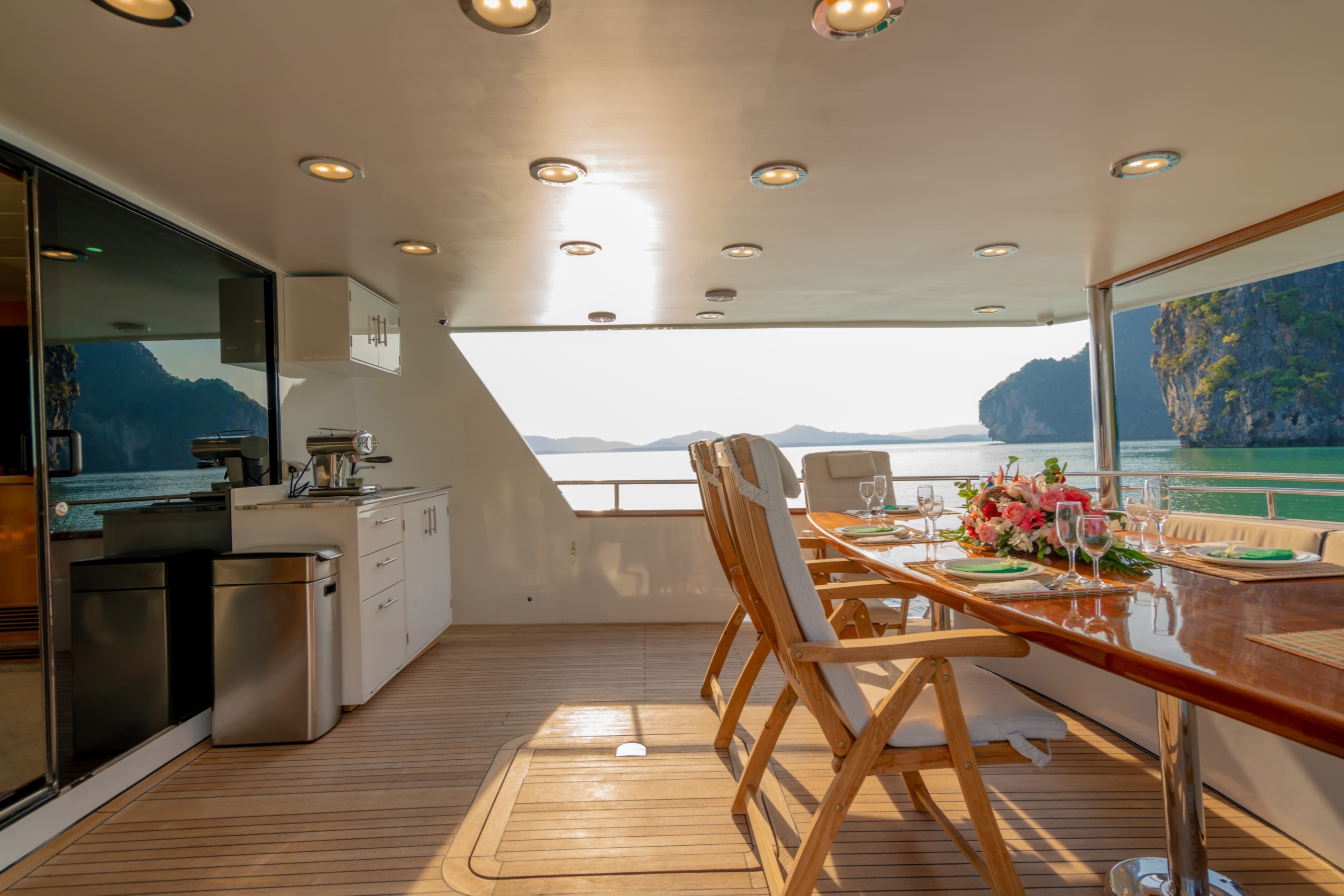 Yacht AJAO has excellent deck space, with a dining area on the aft deck, and sun pads forward for enjoying the sun or taking an afternoon nap.