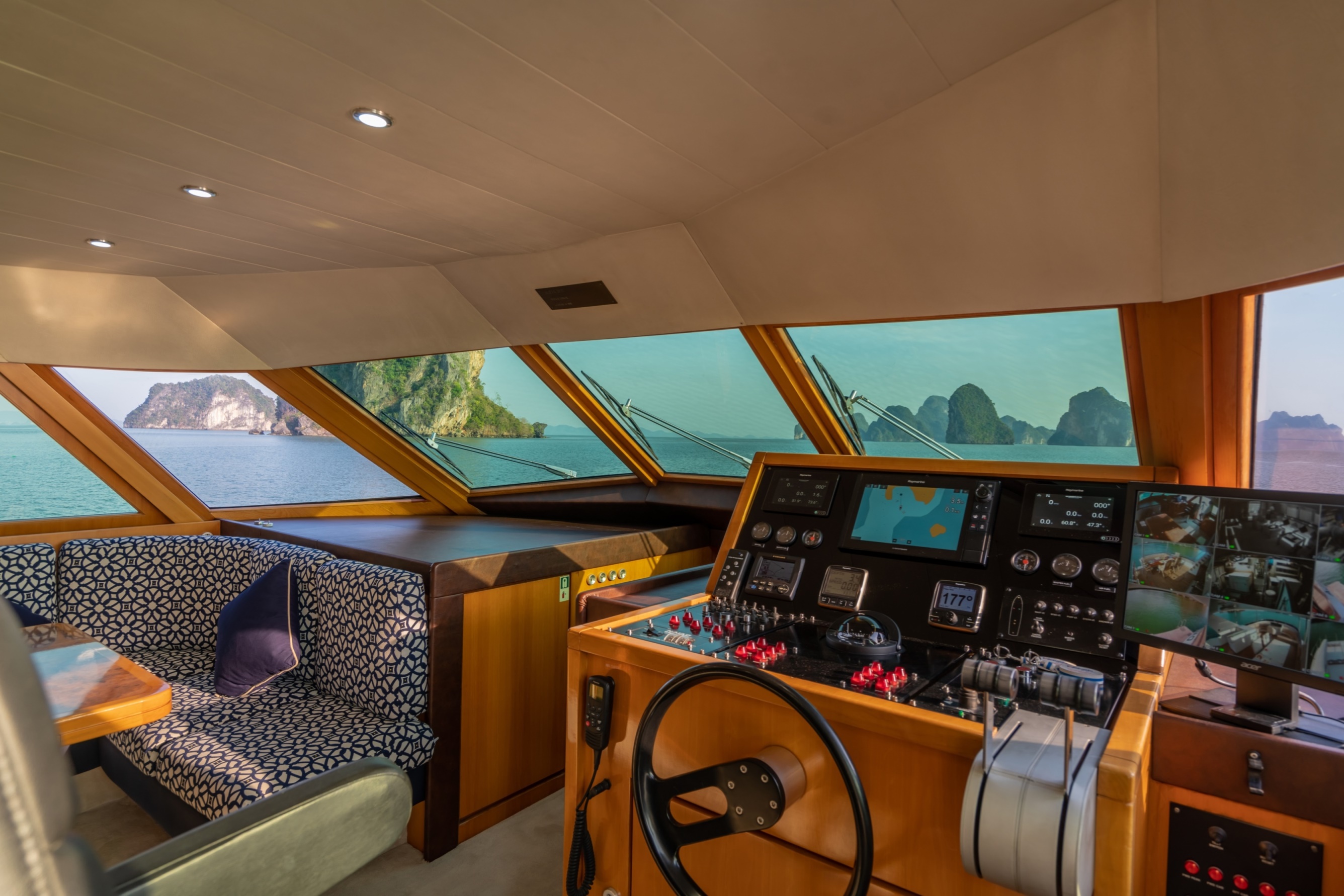 She has a good-sized and comfortable main salon with stairs leading to a separate dining area further forward on the bridge deck, where you can also enjoy the raised view.
