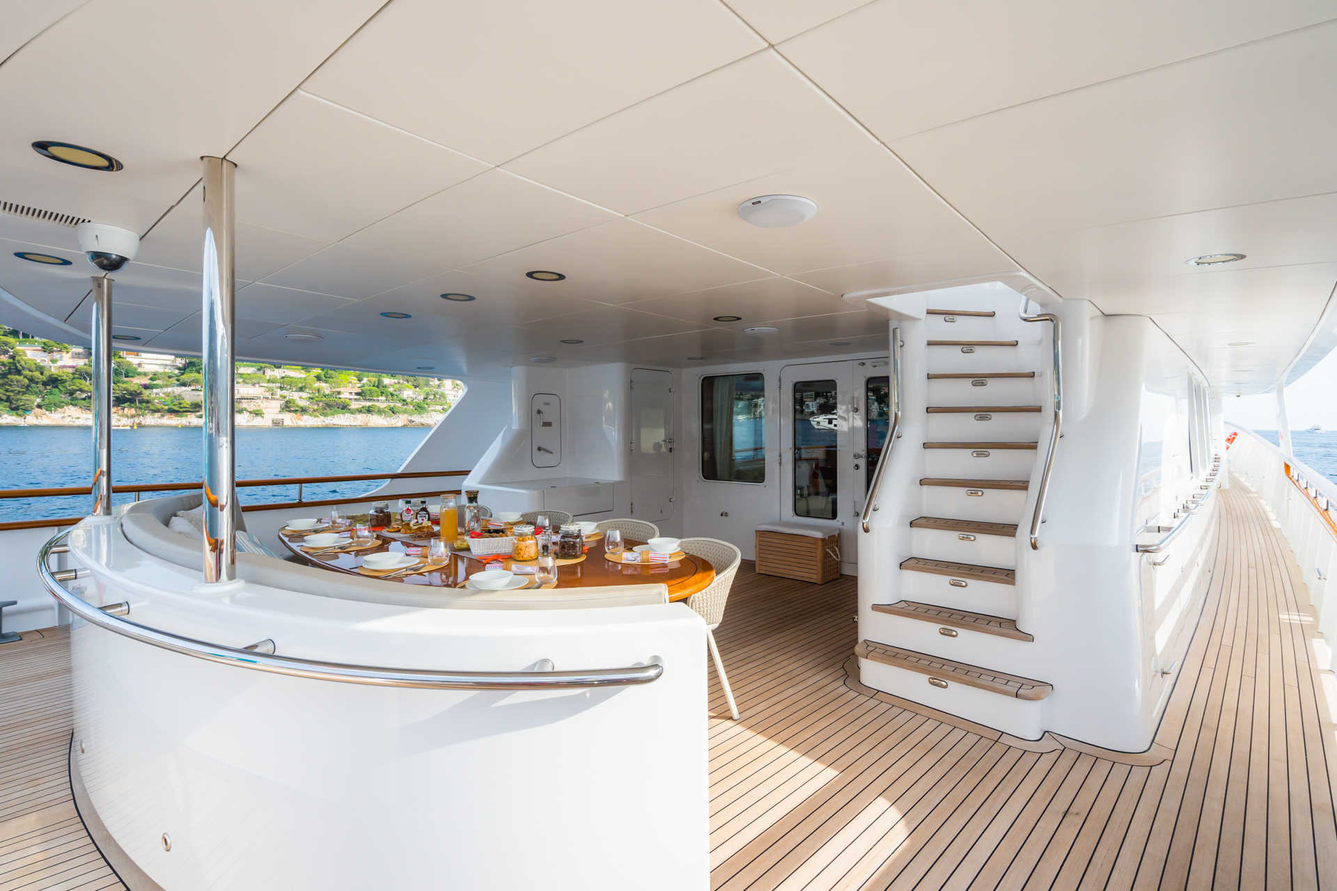 On deck the Motor Yacht CORNELIA has ample deck space; the aft deck is large and features an alfresco dining option, additional aft seating, and plenty more socializing room. Above the main deck, the sundeck and sky lounge offers ...