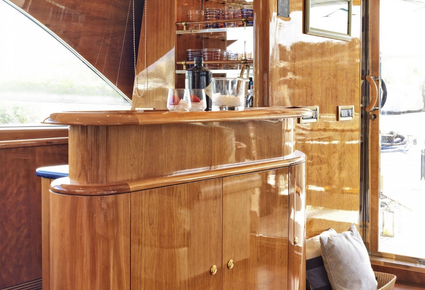 There is a comfortable main salon with plush cream sofa seating, an attractive bar area and a separate elegant dining area forward.