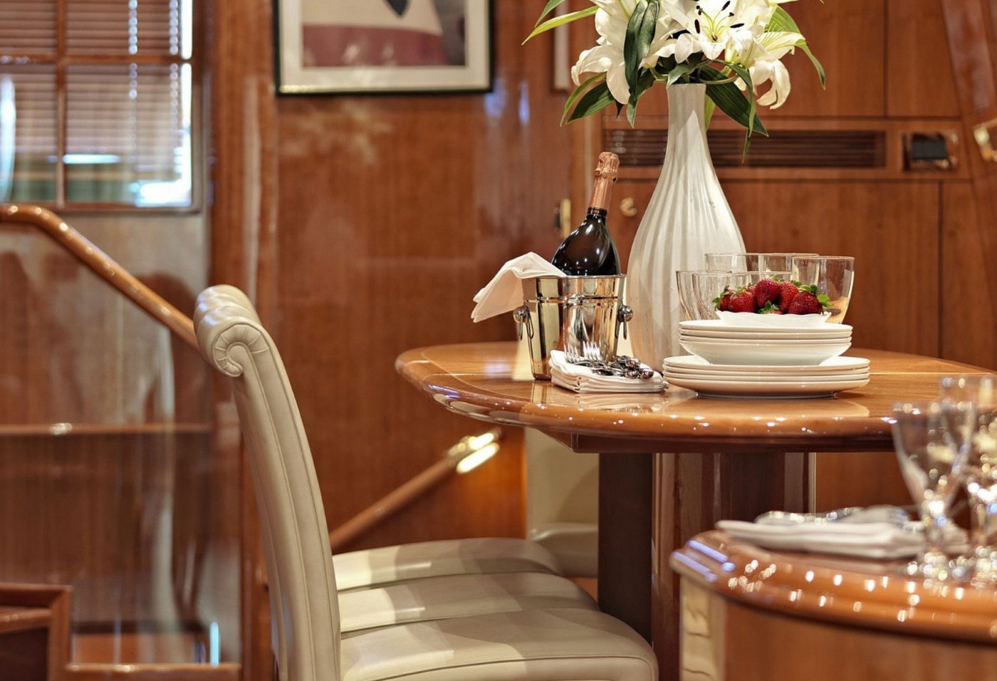 There is a comfortable main salon with plush cream sofa seating, an attractive bar area and a separate elegant dining area forward.