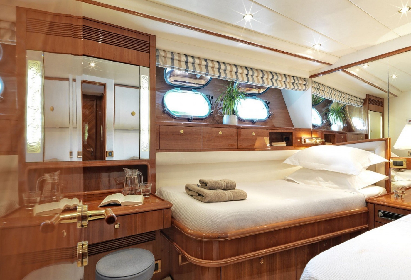 The ATALANTI motor yacht has an attractive contemporary interior, nicely decorated with cream soft furnishings, with touches of beige, navy blue and caramel, with high gloss wood cabinets and wooden flooring in the salon, and soft carpeting in the staterooms.