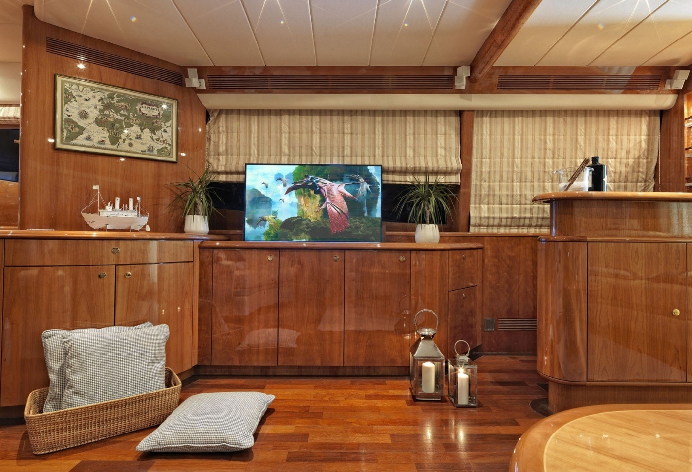 There is a comfortable main salon with plush cream sofa seating, an attractive bar area and a separate elegant dining area forward.