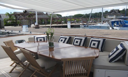 The top deck features a generous sundeck with sunpads and includes the fly bridge helm and a perfect alfresco breakfast, lunch or cocktail table.